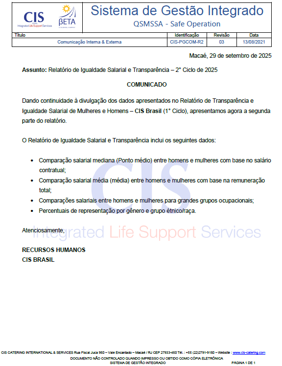 Relatório de Igualdade e Transparência – COMUNICADO CIS BRASIL – Download Aqui!